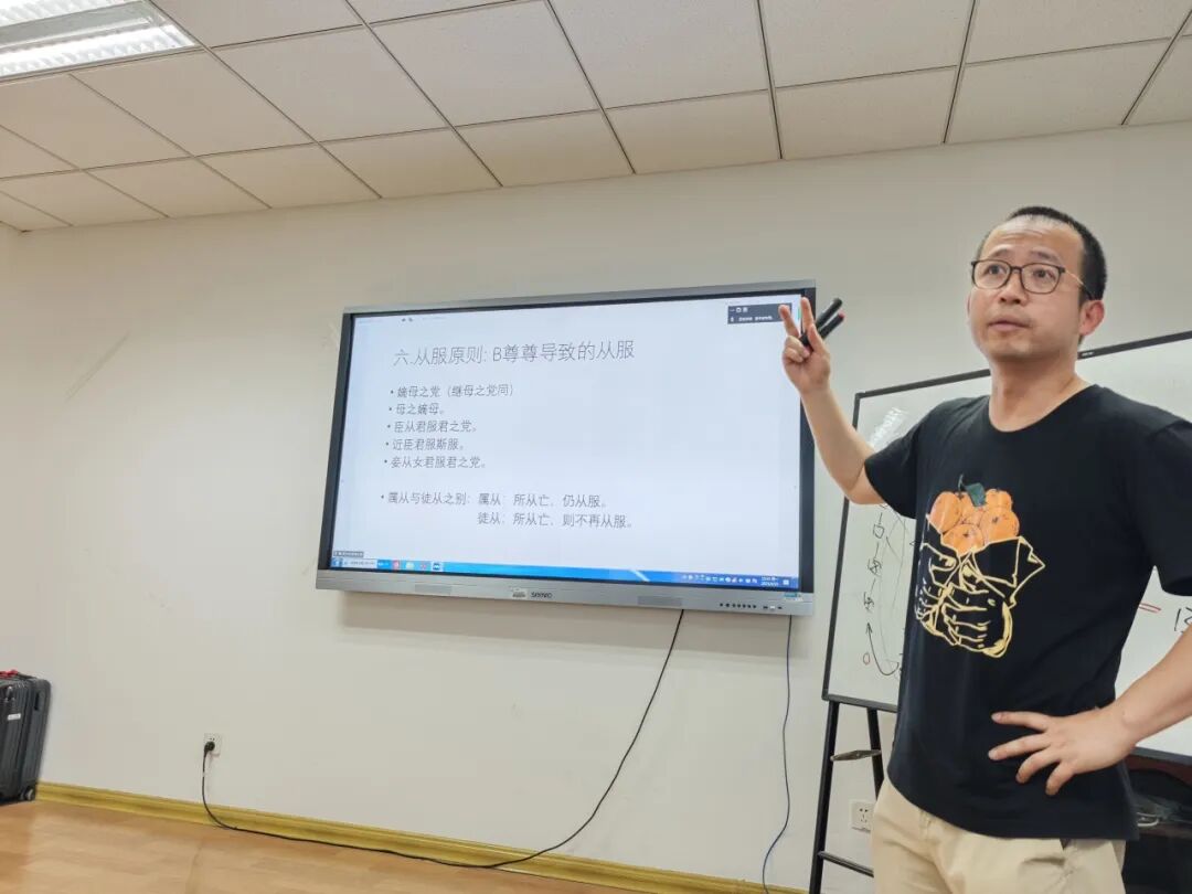 在交流环节,黄铭老师耐心地回应了线上线下师友的提问,并针对孙逸超老师提出的学界存在分歧的“三年丧”问题作出了说明。黄铭老师认为由闻远先生、吴飞老师等采用的“至亲以期断”—加隆—降服的计算方法是正确的,但将起点“至亲以期断”理解成爱敬一体的做法会使得亲亲成为唯一的基础,尊尊变成亲亲的衍生。因此他认为“至亲以期断”是一个假设性的方便法门,即对于至亲的丧期计算都先假设为期年的旁亲,然后再根据所服对象判断是依据亲亲还是尊尊进行加隆,再依据是否传重等因素进行降服。黄铭老师认为这种方式使得亲亲和尊尊取得对等的地位,避免了对主张亲亲、尊尊两套原则并存的公羊学的破坏。