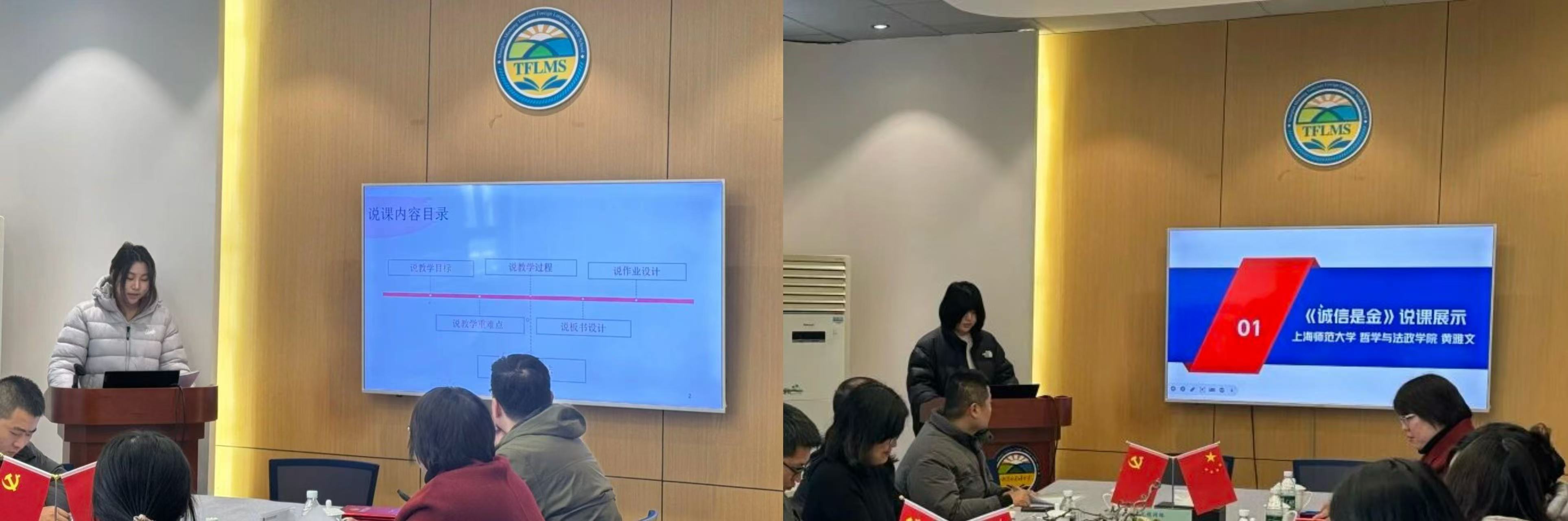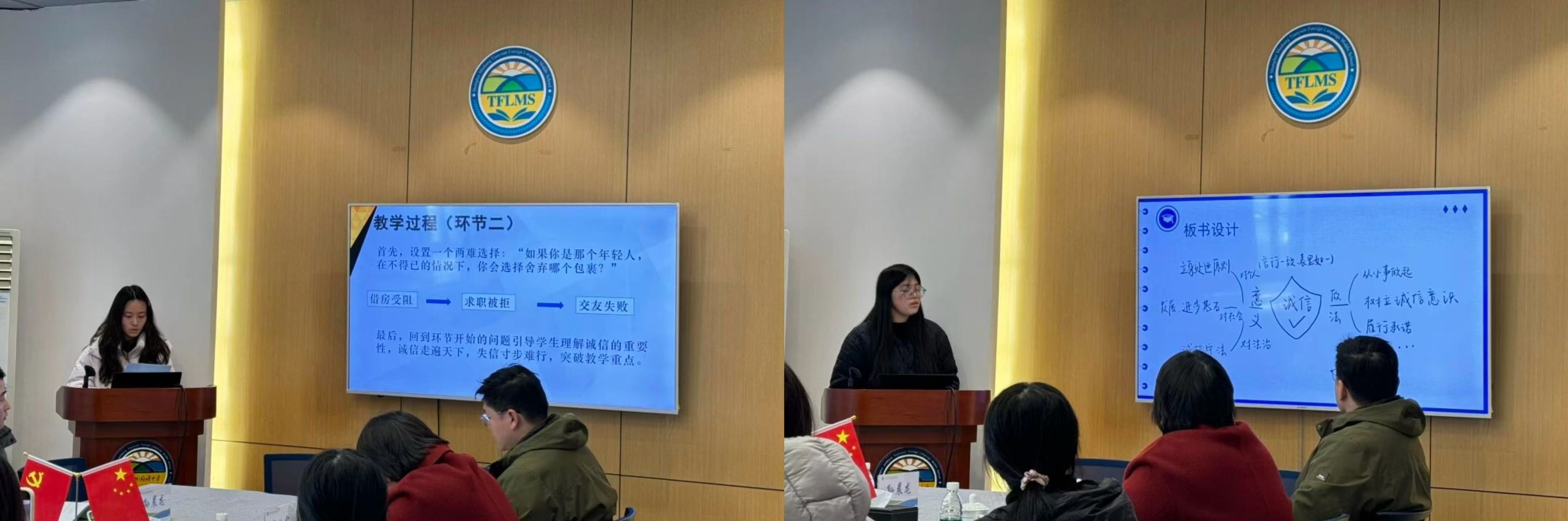 在教学展示环节,2023级思想政治教育(道德与法治)专业5位见习师范生走上讲台进行说课展示。同学们针对同一主题分别设计图片导入激发价值思考、以生活化案例导入引导议题辨析,或运用角色扮演深化情感体验、联系学生日常行为细节进行深度反思等,充分展现了同一主题下多元教学策略的精心设计。